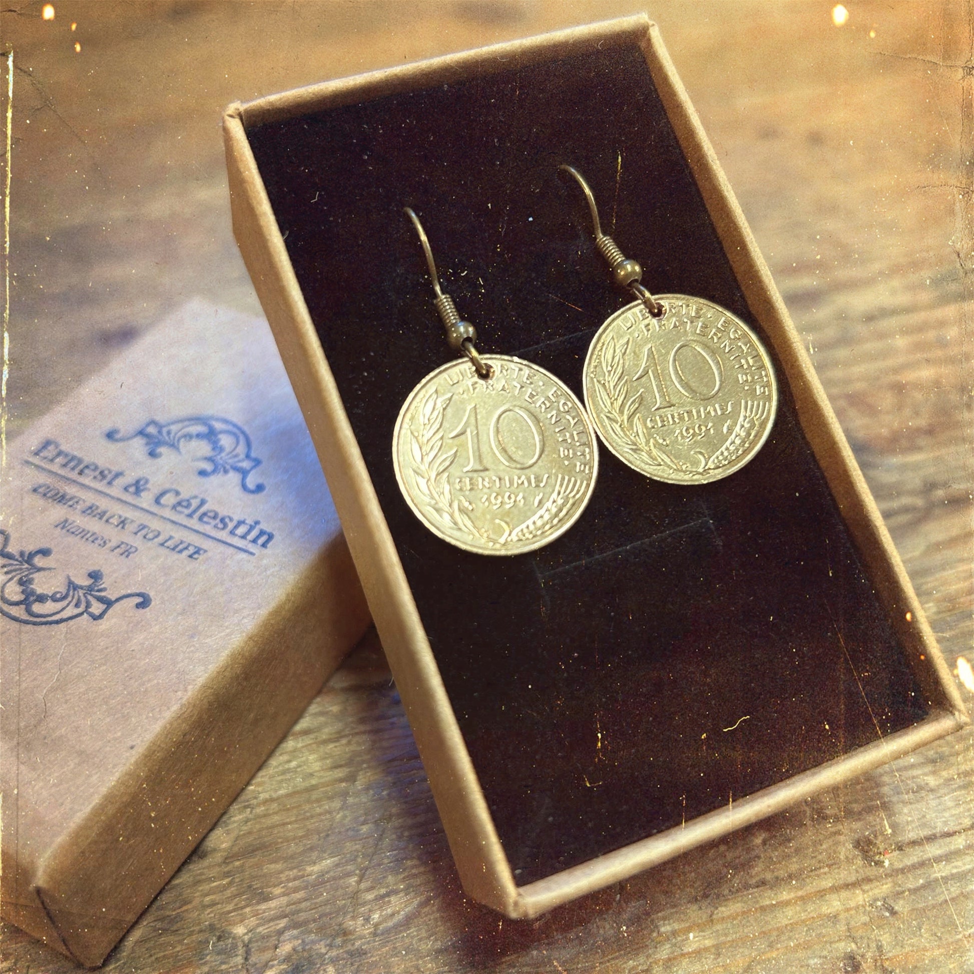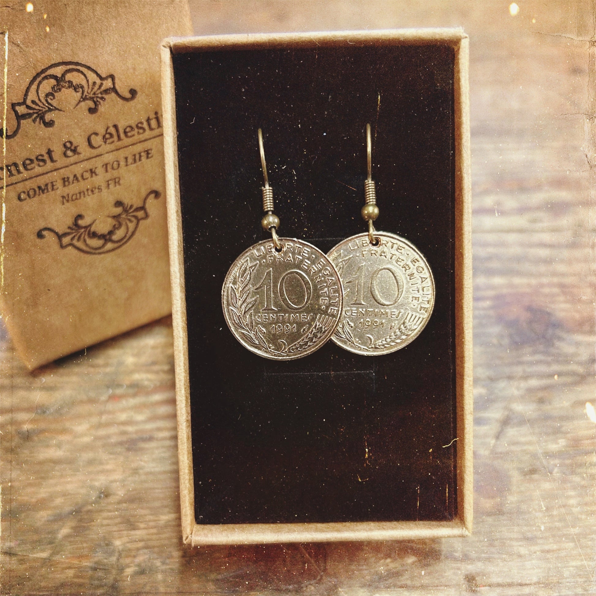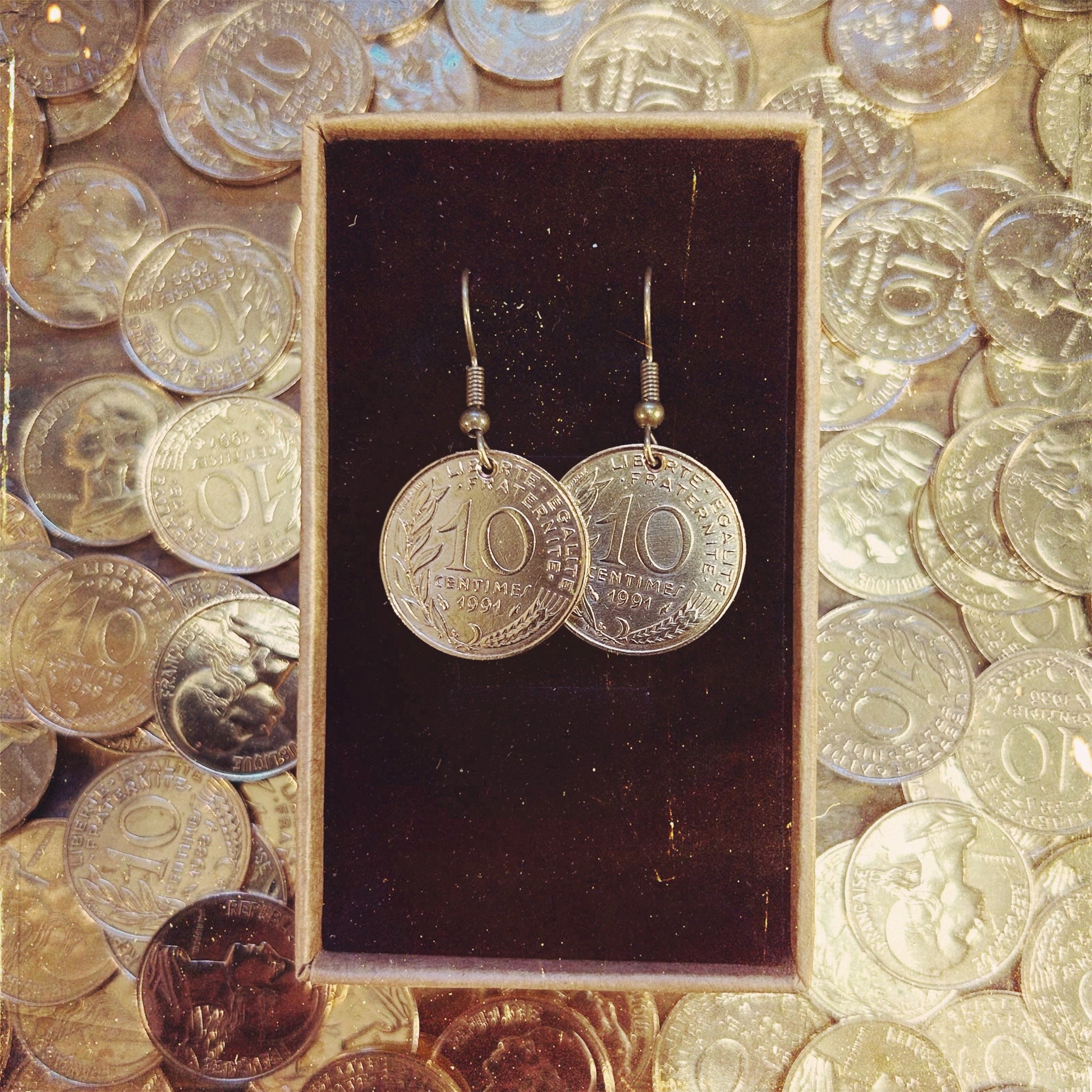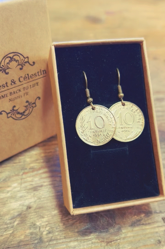 Jolie paire de boucles d'oreilles créées à partir d'anciennes pièces de 10 centimes de Francs !