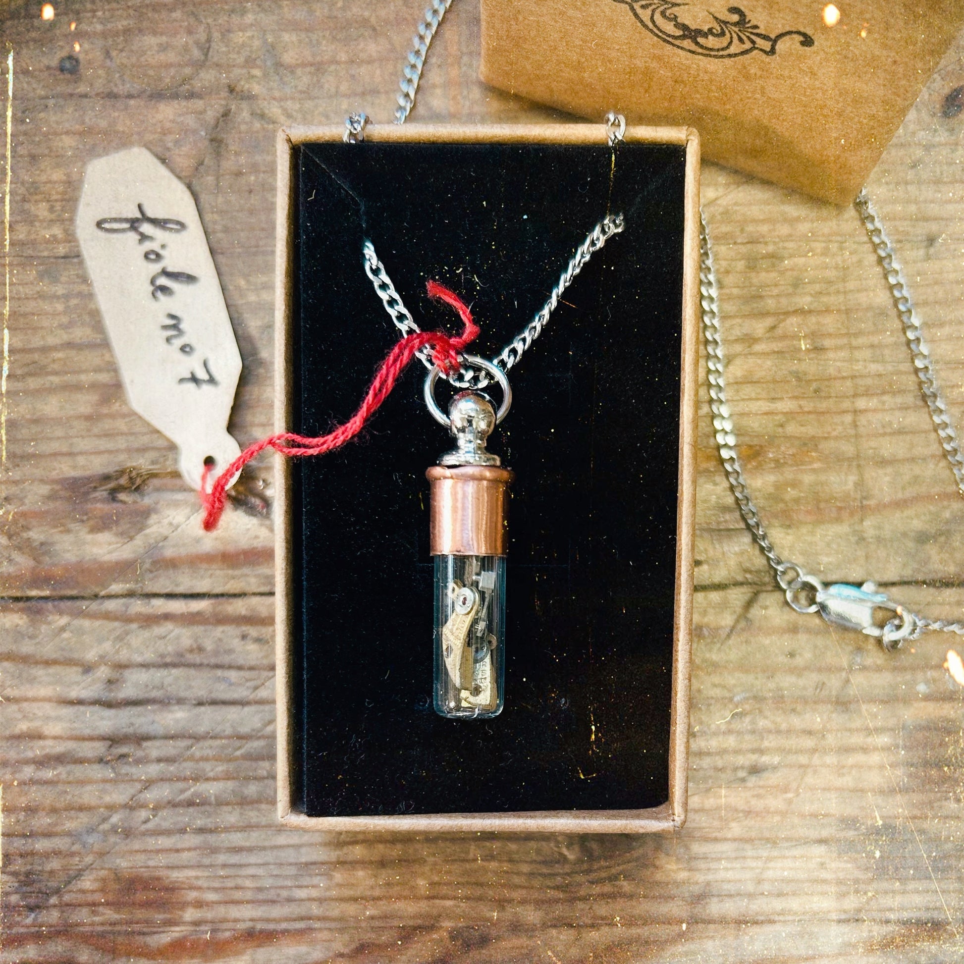 Pendentif Fiole fabriquĂ© Ă partir dâanciennes petites fiole  en verre destinĂ© au mĂ©tier dâhorloger.